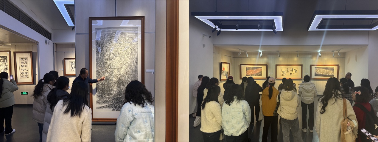 讲解员细致讲解了馆内收藏的陶瓷、书画等各类展品,从创作背景、艺术手法到文化内涵,层层深入、娓娓道来。同学们认真聆听、驻足观赏,不时与老师、同学交流见解,在凝视笔墨丹青的雅致、触摸工艺传承的温度中,感受中华优秀传统文化的博大精深。老师们结合展品中的文字符号、地域文化等元素,现场解读语言与艺术创作、文化传承的紧密关联,让同学们深刻体会到“语言是文化的载体,文化是语言的灵魂”。