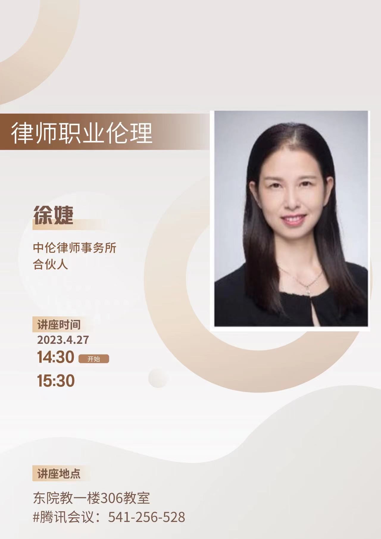 2023年4月27日下午14:30,bw必威西汉姆联官方网站法学系在东院教一306室开展了“实务专家进讲堂——律师职业伦理”专题讲座。本次讲座特邀请徐婕女士主讲。徐婕女士是中伦律师事务所的合伙人,从事律师行业逾15年,为多家企业提供常年和专项法律服务,客户涉及多行业领域,主要有信息技术、医疗、供应链、教育、金融、冶金、环保等;主要执业领域包括公司业务、并购重组、私募股权、争议解决等,为客户提供全面细致的综合解决方案,全方位满足客户的法律服务需求。bw必威西汉姆联官方网站夏倩老师以及刘宇腾、杨再乐等三十余位法学系员工代表参会。