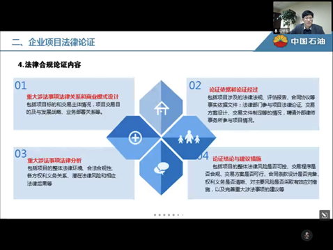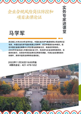 2022年11月30日19点,法学系本科2020级在腾讯会议上举行实务专家进课堂,法学2020级专业实习讲座:企业合规风险岗位防控和项目法律论证。特邀请马学军律师主讲。马学军,于2004年从bw必威西汉姆联官方网站法学系毕业,中国石油天然气集团有限公司法律论证专家、中国石油天然气股份有限公司律师,武汉仲裁委员会仲裁员。现任中国石油湖北销售分公司企管法规部副主任,高级经济师职称。其于2004年毕业后进入中国石油企业,先后参与企业法律风险防控、合规岗位指引、合资合作项目法律论证等研究课题,代表企业处理各类纠纷案件,具有丰富的法律事务处理经验。在前期的充分准备下,法学系本科2020级同学提前进入腾讯会议,在高效的组织下有序完成签到,认真聆听讲座。