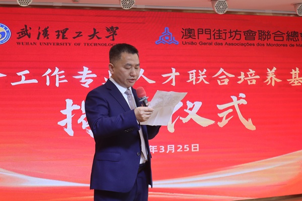 On March 25th, Professor Liu Jieming, Dean of Wuhan University of Technology (WHUT), joined União Geral das Associações dos Moradores de Macau(UGAMM) Vice President Law Tak Ming and other representatives to jointly inaugurate the "Guangdong-Macao In-Depth Cooperation Zone in Hengqin Joint Training Base for Social Work Professionals". Established by WHUT and União Geral das Associações dos Moradores de Macau(UGAMM), the base aims to explore innovative models for cultivating social work talent in the Guangdong-Hong Kong-Macao Greater Bay Area and promote the deep integration of livelihood services between Hengqin and Macao. Participants included Professor Liu Jieming, Associate Dean Bu Qingping, Professor Qin Qin (Head of Sociology Discipline), União Geral das Associações dos Moradores de Macau(UGAMM) Vice President Law Tak Ming, União Geral das Associações dos Moradores de Macau(UGAMM) Guangdong Office Director Tian Yi, and União Geral das Associações dos Moradores de Macau(UGAMM) Guangdong Office Deputy Director Liu Zhifeng.