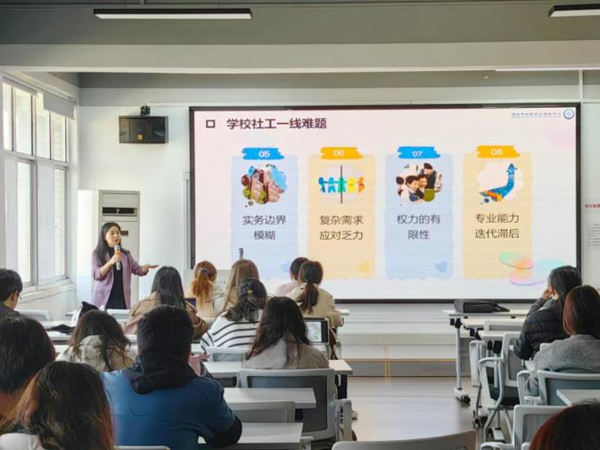 任海卫从一线实践中的身份定位、资源整合等核心挑战切入,系统梳理了公司社工面临的现实难题。她重点分享了深圳在实践中形成的“体系化、标准化、协同化、整合化、项目化”服务模式,强调其核心在于通过构建多层次服务网络和标准化流程,依托跨部门协同,实现“家-校-社”资源的有效整合。在服务策略层面,任海卫提出公司社工应注重服务内容与公司德育体系、教学安排及治理目标的深度契合。她认为,服务的精准性与创新性是提升成效的关键,并结合多个项目案例分享了在生命教育、特殊员工支持等领域形成的实践经验。此外,她还解读了深圳市近期出台的多项社工行业政策,邀请在座员工投身到社工行业中。