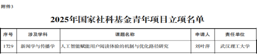 近日,教育部社会科学司、全国哲学社会科学工作办公室先后发布了《2025年度教育部人文社会科学研究规划基金、青年基金、自筹经费项目评审结果的公示》《关于2025年国家社会科学基金项目立项名单的公示》。公司刘叶萍老师申报获得2025年国家社科基金青年项目立项,卜清平特岗教授申报获得2025年国家社会科学基金后期资助项目立项,周群英副教授、阎维博老师申报获得2025年度教育部人文社会科学研究规划基金、青年基金项目立项,具体名单如下: