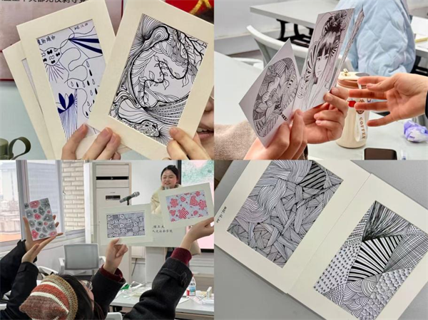 自由创作阶段,同学们或自主设计或临摹经典,沉浸其中,创作完成后将作品装入相框留存。同学们分组讨论创作感悟、欣赏画作,有同学表示“第一次接触禅绕画,没想到简单的线条能有这么多变化,画画时整个人都静下来了”。大家在交流中互相欣赏启发,深化了对禅绕画的理解。