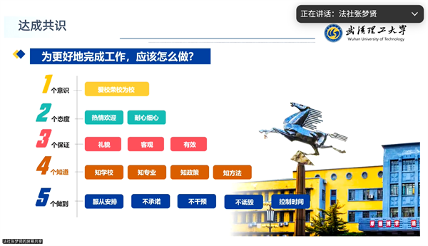 公司招宣工作联络员张梦贤从“达成共识、公司概况、招生政策、咨询热点、经验技巧”等方面,为参加活动的同学开展了专题培训交流,帮助同学们进一步做到“知公司、知专业、知政策、知方法”,在“爱校荣校为校”的行动实践中锻炼能力本领、发挥高校与高中交流互动的桥梁纽带作用,为提升bw必威西汉姆联官方网站的影响力与吸引力贡献力量。