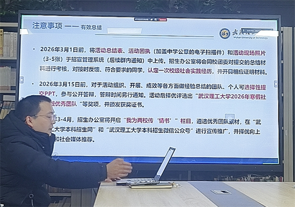 1月8日下午,公司在南湖校区敏行辅导员工作室,通过线上线下相结合的方式,举行了2026年“寒假母校行”活动培训。活动邀请了2025年“寒假母校行”获奖优秀团队代表刘婷同学作分享交流,公司招宣工作联络员张梦贤以及报名云南、湖北潜江两地与部分武汉市中学“寒假母校行”活动的同学参加了学习。