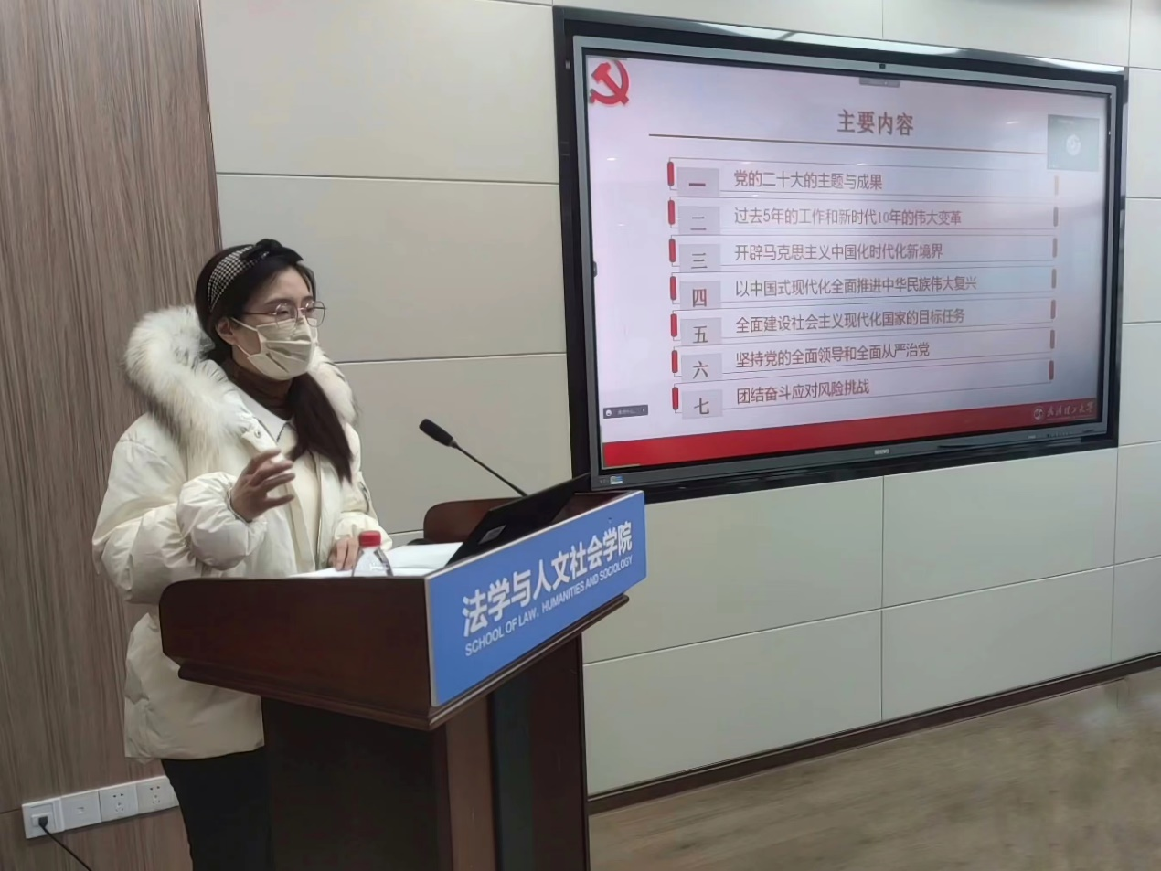 党课第三讲,许瑶老师以“以中国式现代化推进中华民族伟大复兴——认真学习贯彻二十大精神”为主题带领同学们进一步深入学习领会了党的二十大报告重要内容。她指出,党的二十大谱写了新的篇章,深刻阐述了习近平新时代中国特色社会主义思想的世界观和方法论,科学回答了中国之问、世界之问、人民之问、时代之问,开辟了马克思主义中国化时代化新境界。她号召全体学员认真对照习近平总书记“五个牢牢把握”重要要求,深刻领会和把握大会主题,切实把思想和行动统一到党的二十大精神上来。
