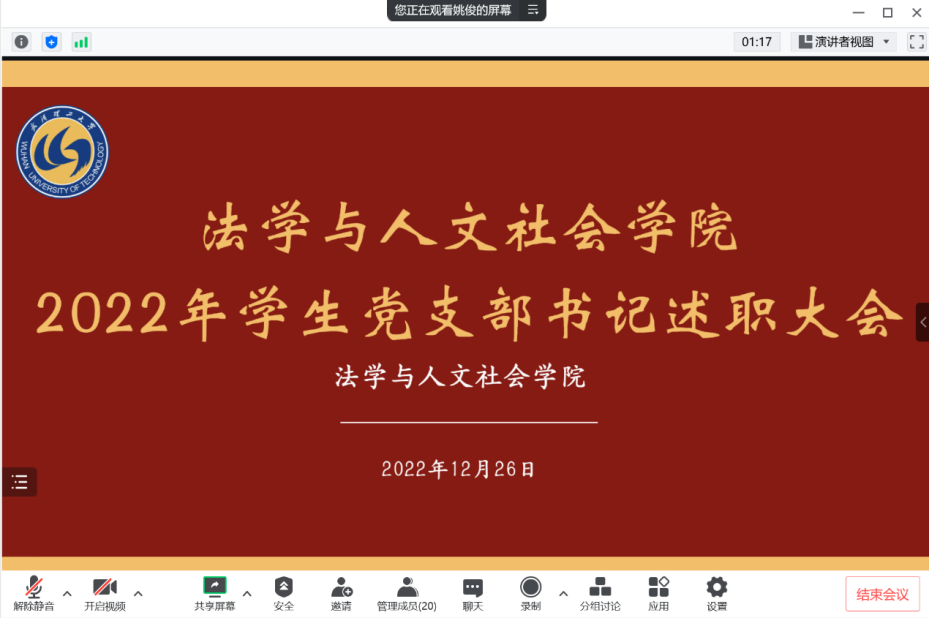 为深入学习贯彻党的二十大精神,全面总结各员工党支部年度党建工作,压实支部书记履行抓基层党建工作第一责任人责任,12月26日下午,公司员工党总支以线上方式召开了2022年度员工党支部书记抓党建工作述职评议考核会。公司员工党总支副书记欧阳国辉、吉成霖及全体员工党支部书记参与会议,会议由研究生辅导员姚俊主持。