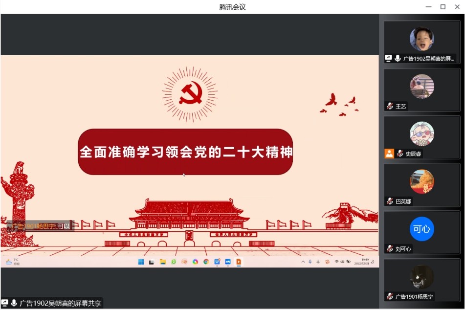 支部党员吴朝喜就“全面准确学习领会党的二十大精神”进行了专题领学,通过对“党的二十大的主题”“过去五年的工作和新时代十年的伟大变革”“马克思主义中国化时代化新境界”和“新时代新征程中国共产党的使命任务”等九大方面的深刻研讨,认识到党的二十大是在全党全国各族人民迈上全面建设社会主义现代化国家新征程、向第二个百年奋斗目标进军的关键时刻召开的一次十分重要的大会,是一次高举旗帜、凝聚力量、团结奋进的大会。他谈到,学习宣传贯彻党的二十大精神,是当前和今后一个时期全党全国的首要政治任务,事关党和国家事业继往开来,事关中国特色社会主义前途命运,事关中华民族伟大复兴,对于动员全党全国各族人民更加紧密地团结在以习近平同志为核心的党中央周围,高举中国特色社会主义伟大旗帜,坚定道路自信、理论自信、制度自信、文化自信,为全面建设社会主义现代化国家、全面推进中华民族伟大复兴而团结奋斗,具有重大现实意义和深远历史意义。