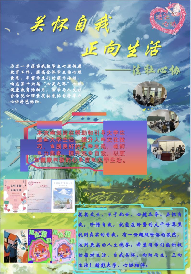 心理海报设计比赛以“关怀自我,正向生活”为主题来号召全体同学创作新心理海报,从而引发他们对于“自我”的思考,帮助他们培养更加积极乐观的生活态度。同时在学习并制作海报的过程中,同学们也学习了心理学相关知识,感受到了心理学的独特魅力,并帮助大家更好地乐纳自我,更加勇敢地面对未来。