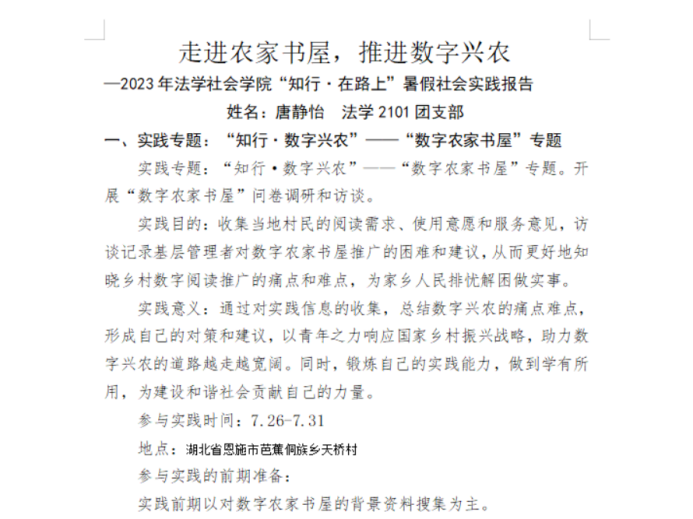 实践队通过收集阅读需求、问询使用意愿、征求服务意见、访谈基层管理者汇总个案访谈,完成数据整理,撰写1万5千字实践报告《走进农家书屋,推进数字兴农》,较为深入地展现了湖北省恩施市芭蕉侗族乡天桥村数字农家书屋的发展概况。报告中提及了天桥村农家书屋协同推广、政企结合、公益参与、村民共建等诸多优势特征,也反映了当前书屋在规划分级、资源分配、软件升级等方面存在的不足。