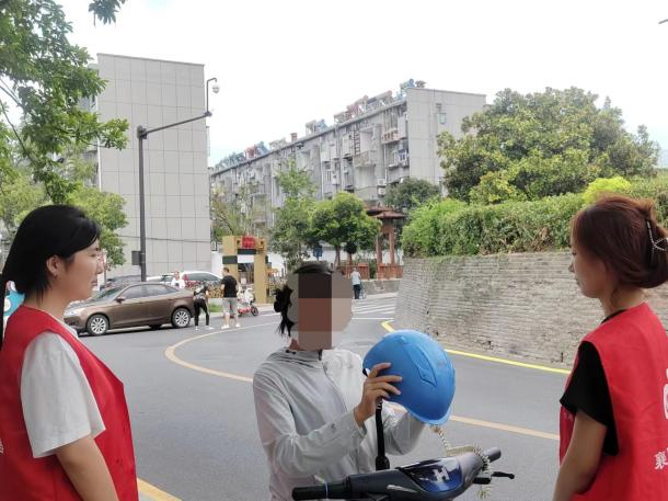 (图3-实践队队员劝导骑行者佩戴头盔)