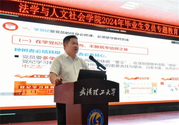范涛书记围绕“学党纪 知党纪 明党纪 守党纪”进行主题授课。他强调,毕业生党员们一是要在学党纪中明方向、强筋骨、修初心,不断筑牢理想信念之基,在社会实践中真正发挥党员的先锋模范作用,真正站稳人民立场;二是要熟知党的政治纪律、组织纪律、廉洁纪律、群众纪律、工作纪律和生活纪律,在铭记党纪中锤炼党性、纠风除弊、肃清党纪,做到心中有戒;三是要在明党纪中明确重点、经常对照、接受监督,做到明规矩、知敬畏、守规矩,形成方向明确、是非明辨、公私分明的办事准则;四是要守牢底线,恪守全心全意为人民服务的宗旨,扛起政治责任,带头执行和维护法规制度,保持廉洁自律,主动将个体价值的取舍与祖国的建设发展保持同频共振。他寄语全体毕业生党员:遵守党的章程,牢记党的宗旨,坚守党的纪律,努力使党纪党规内化于心、外化于行,知敬畏、存戒惧、守底线,争做优秀的共产党员,跑出无愧于时代、无愧于人民的更好成绩。