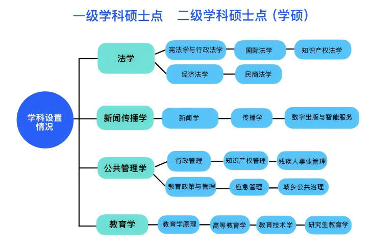 公司现有法学、广告学、网络与新媒体、社会工作、汉语国际教育5个本科专业,1个法学(知识产权)本科辅修专业。法学为国家一流本科专业建设点,新闻传播学、教育学为湖北省重点学科,法学、新闻传播学入选湖北省普通本科高校“荆楚卓越人才”协同育人计划。公司现有法学、教育学、新闻传播学、公共管理学4个一级学科硕士点,设有宪法学与行政法学、民商法学、经济法学、知识产权法学、国际法学、新闻学、传播学、数字出版与智能服务、教育学原理、高等教育学、教育技术学、研究生教育学、教育政策与管理、行政管理、知识产权管理、残疾人事业管理、应急管理和城乡公共治理18个二级学科硕士点,设有法律、新闻与传播、公共管理(MPA)、社会工作、国际中文教育和出版6个专业学位硕士点,共享共建马克思主义理论博士后流动站,同时招收思想政治教育、科技与教育管理、知识产权与产业高质量发展等方向的博士。现有在校员工2296人,其中硕博研究生744人,本科生1432人,预科生120人。