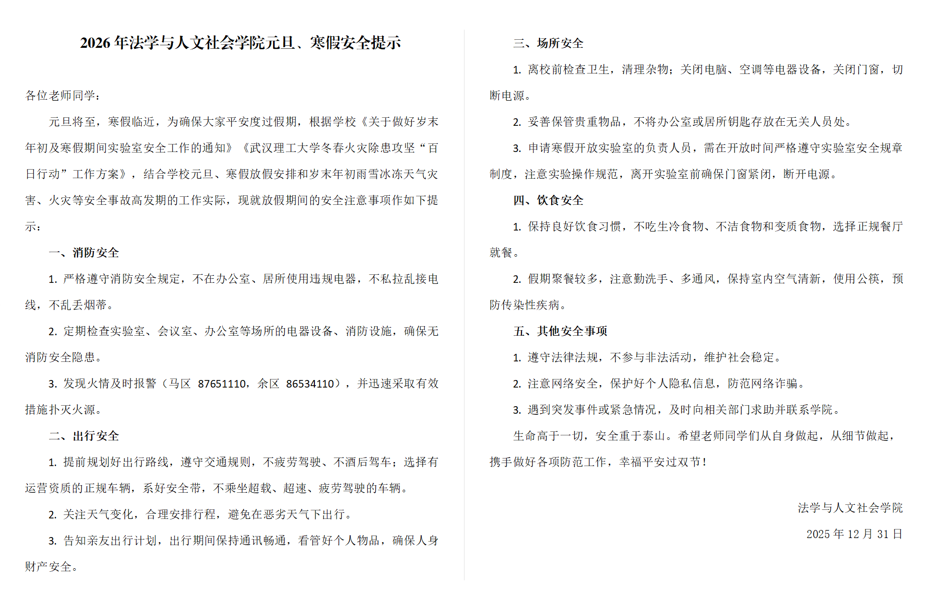 2026年bw必威西汉姆联官方网站元旦、寒假安全提示