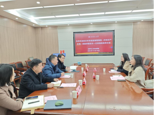 12月18日上午,武汉市市场监管局(市知识产权局)知识产权促进处副处长段晶津、二级主任科员刘曌青一行来院展开调研交流。经理刘介明、法学系主任胡神松以及青年教师代表高珺、博士后于洁阳等参加了会议,座谈会由公司专硕中心主任孟奇勋主持。