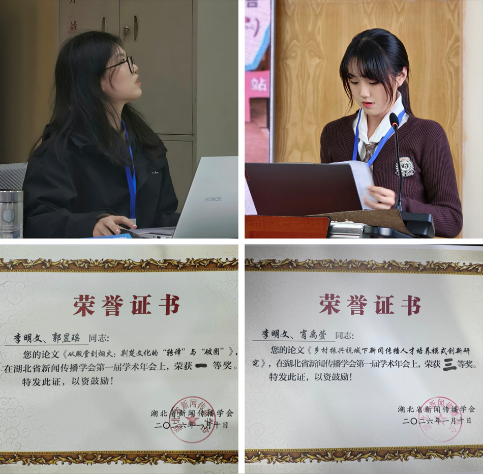李明文老师指导研究生郭昱瑶提交的论文《从殿堂到烟火:荆楚文化的“转译”与“破圈”》,荣获一等奖。作品聚焦荆楚文化跨文化传播困境,以文创为媒介,整合文化折扣等理论构建分析框架,通过博物馆、方言、科技三类文创案例,从内容、技术、传播层面提出深层转译、科技赋能、全球网络的传播体系,为荆楚文化的“转译”与“破圈”以及国际化传播提供路径。研究生肖禹萱提交的论文《乡村振兴视域下新闻传播人才培养模式创新研究》,荣获三等奖。文章聚焦乡村振兴战略下新闻传播人才供需错位问题,通过分析“东方甄选”助农直播、浙江长兴县融媒体中心等典型案例,明确乡村所需复合型人才的核心能力,提出跨学科教学、搭建乡村实践基地、强化乡土情怀培育等举措,旨在培养能服务乡村传播、治理与发展的“乡村数字生态构建者”,助力乡村实现自主叙事与可持续发展。